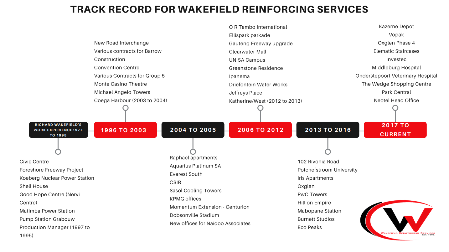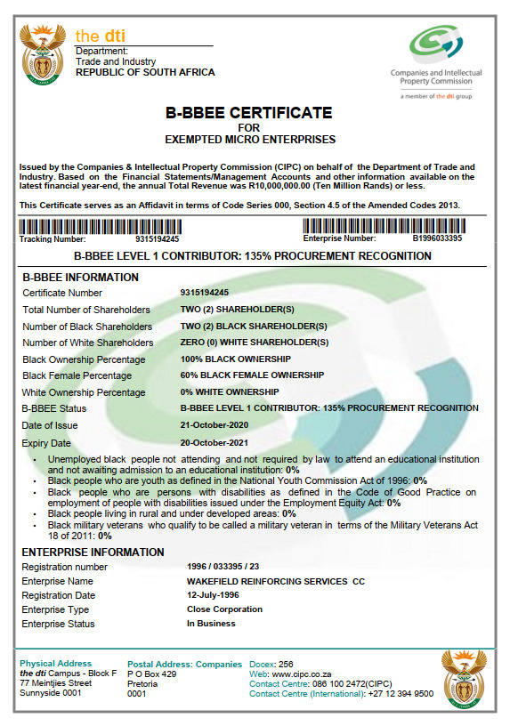 Wakefield Reinforcing Services cc is a level 1 B-BBEE black female-owned company servicing the building, civil, construction, and engineering industries of South Africa since its establishment in 1996.
